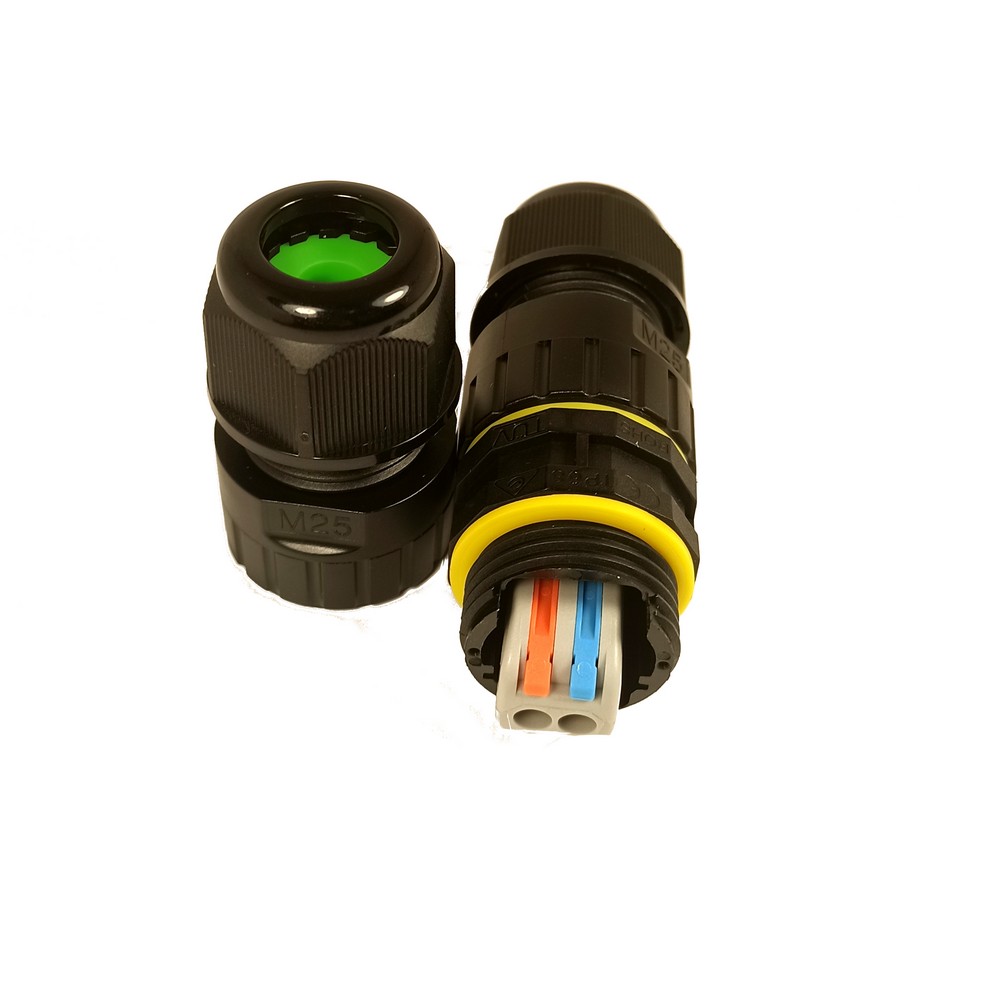 Герметичний кабельний з'єднувач. Різьба М25. Кількість контактів: 2 Діаметр кабелю: 5-8.5 мм. IP68. Самозажімние клеммник всередині