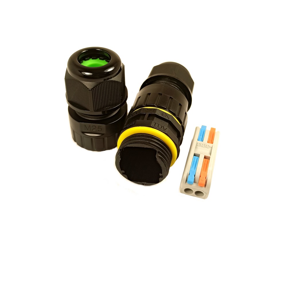 Герметичний кабельний з'єднувач. Різьба М25. Кількість контактів: 2 Діаметр кабелю: 9-12 мм. IP68. Самозажімние клеммник всередині