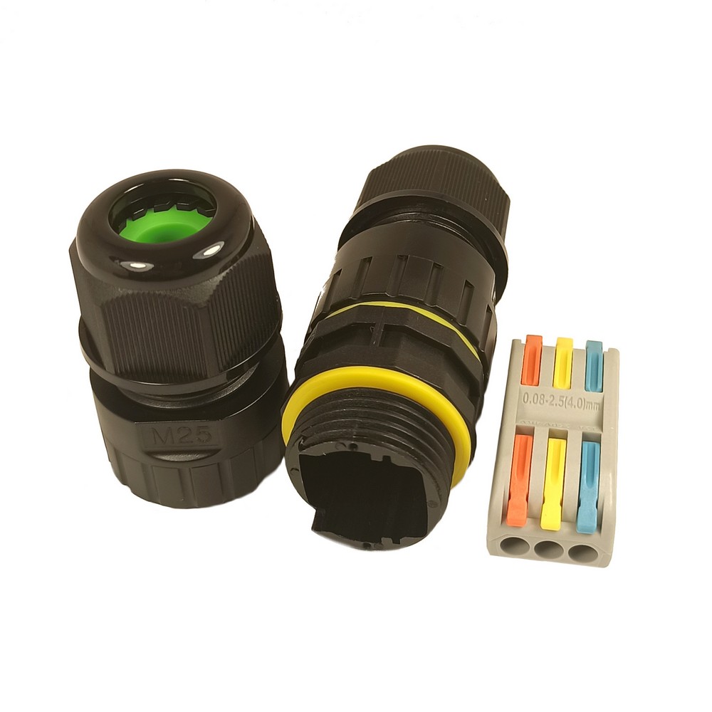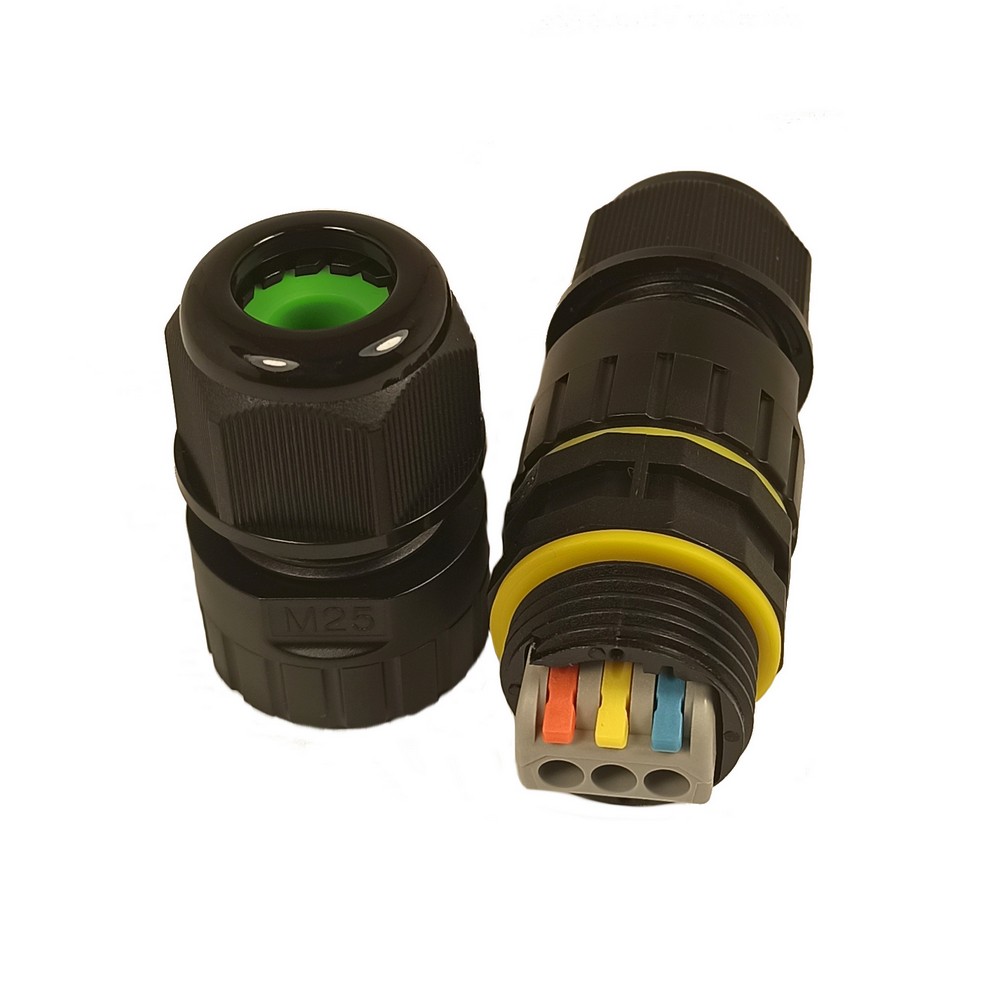 Герметичний кабельний з'єднувач. Різьба М25. Кількість контактів: 3 Діаметр кабелю: 9-12 мм. IP68. Самозажімние клеммник всередині
