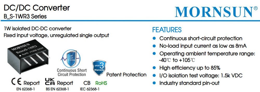 SIP4, Однополярный DC/DC преобразователь питания 1 Вт. 4.5В...5.5В, 200 мА, 83%, 1.5kVDC, 11.6×6×10.16 мм, -40°C...+105°C