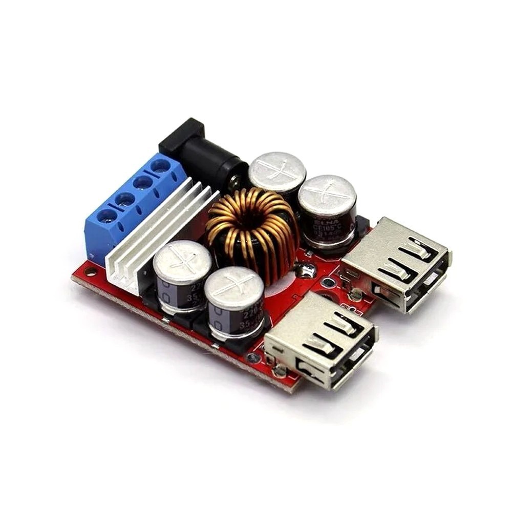 Понижающий DC/DC преобразователь с двумя USB выходами. Uвых. 5 В. макс. кратковременный ток: до 3 А. Входное напряжение: 6...26 В.