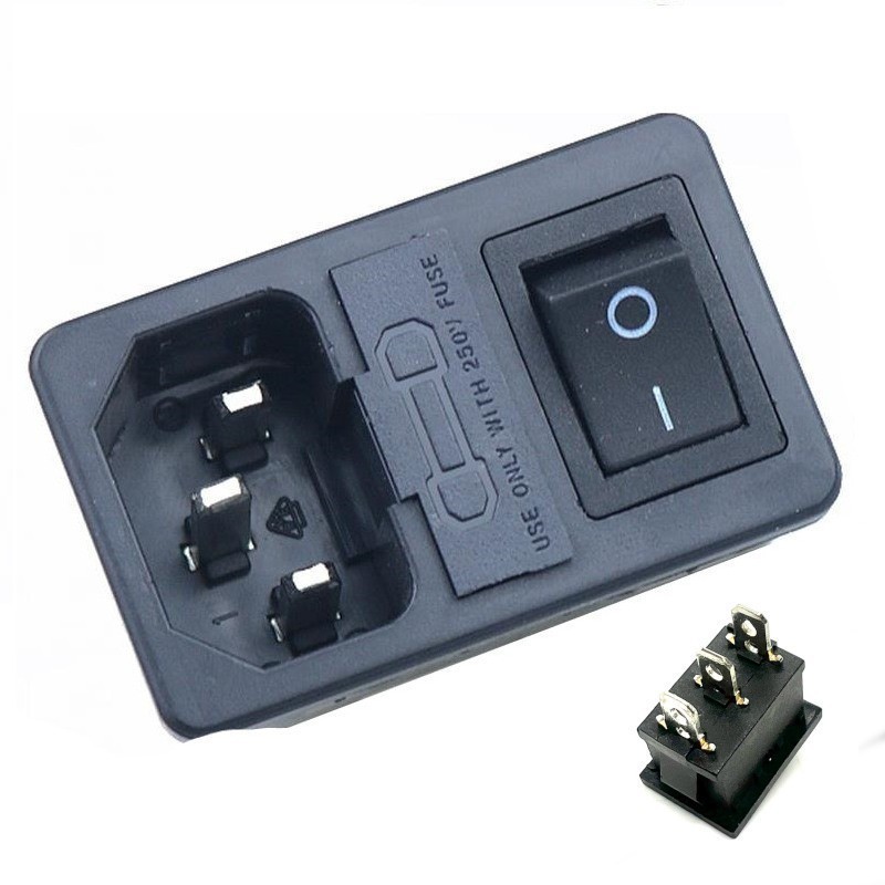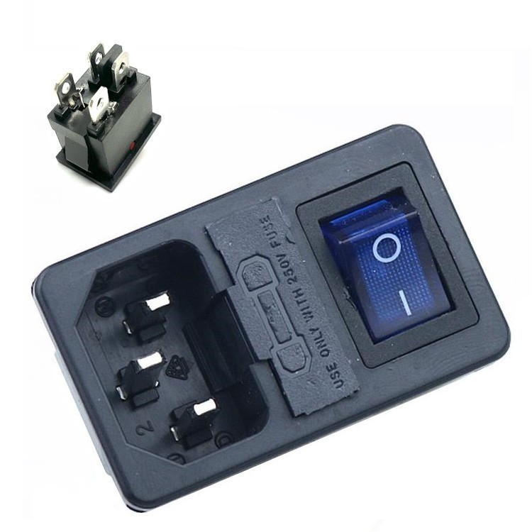 Разъем питания 3 контакта, с выключателем и отсеком для предохранителя. Цвет выключателя: синий. 250 В. 10 А. Без подсветки. Защелки: 2 мм.