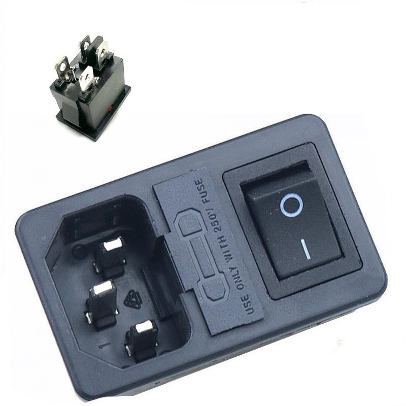 Разъем питания 3 контакта, с выключателем и отсеком для предохранителя. Цвет выключателя: черный. 250 В. 10 А. Защелки: 1 мм.