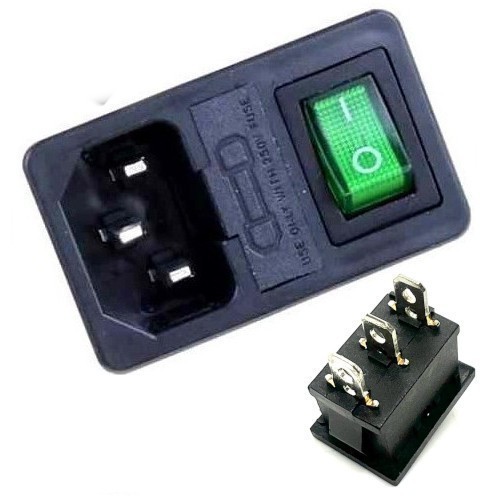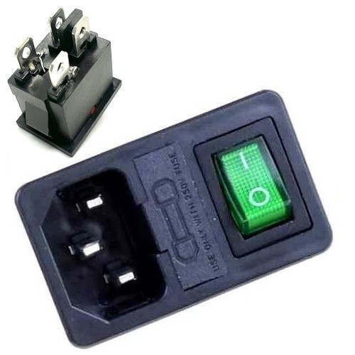 Разъем питания 3 контакта, с выключателем и отсеком для предохранителя. Цвет выключателя: зеленый. 250 В. 10 А. Без подсветки. Защелки: 1 мм.