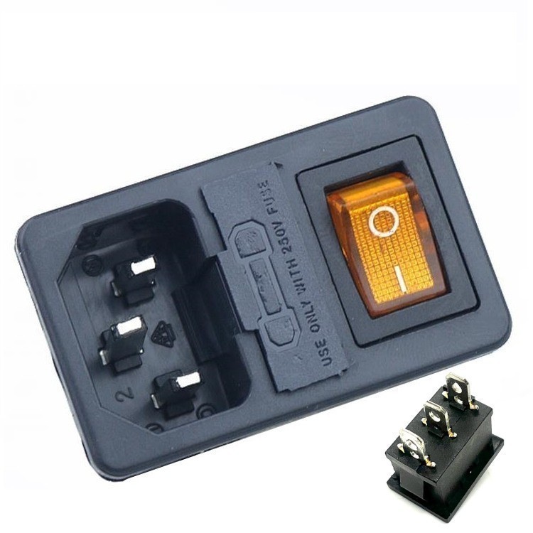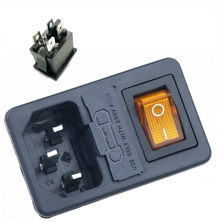 Разъем питания 3 контакта, с выключателем и отсеком для предохранителя. Цвет выключателя: оранжевый. 250 В. 10 А. С подсветкой. Защелки: 1 мм.
