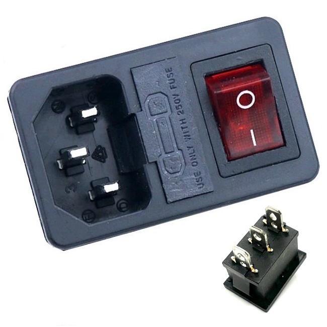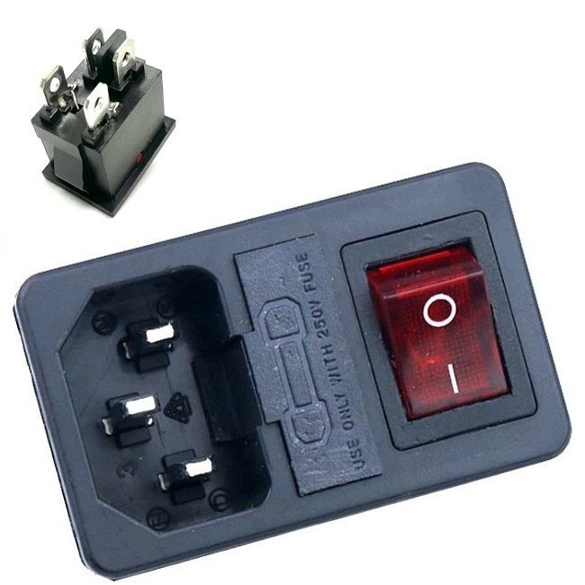Разъем питания 3 контакта, с выключателем и отсеком для предохранителя. Цвет выключателя: красный. 250 В. 10 А. С подсветкой. Защелки: 1 мм.