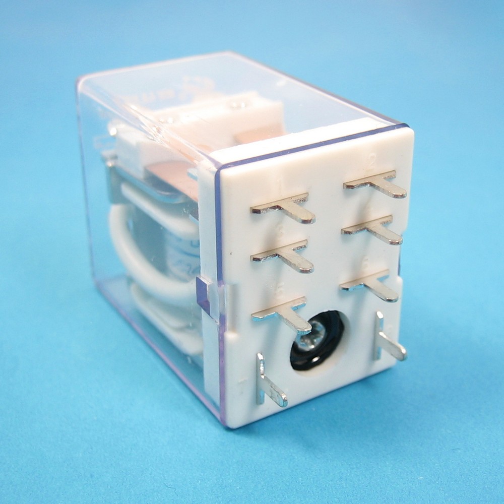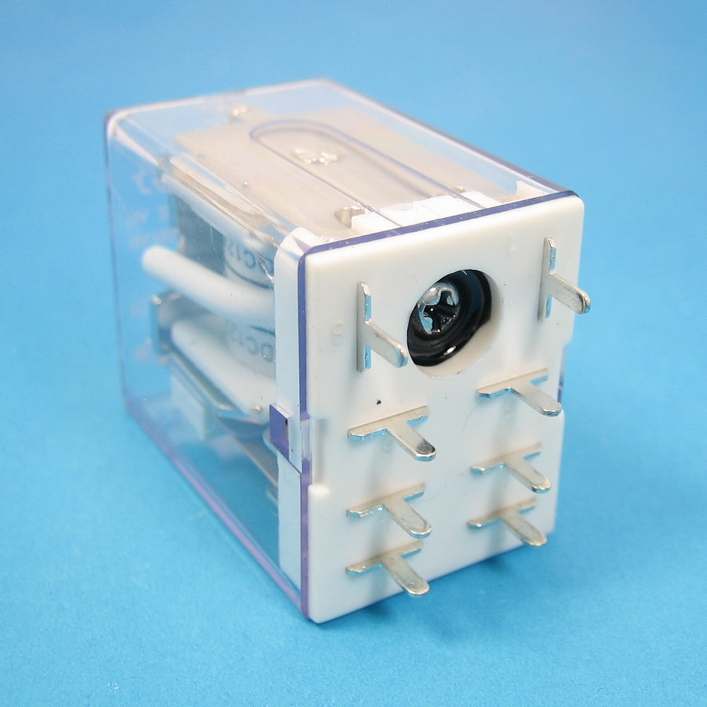 напряжение 220VAC. - Тип контактов 2 С - параметры контактов 5 A 250VAC/30VDC, Монтаж в колодку, Размер:27.5x21.5x35мм