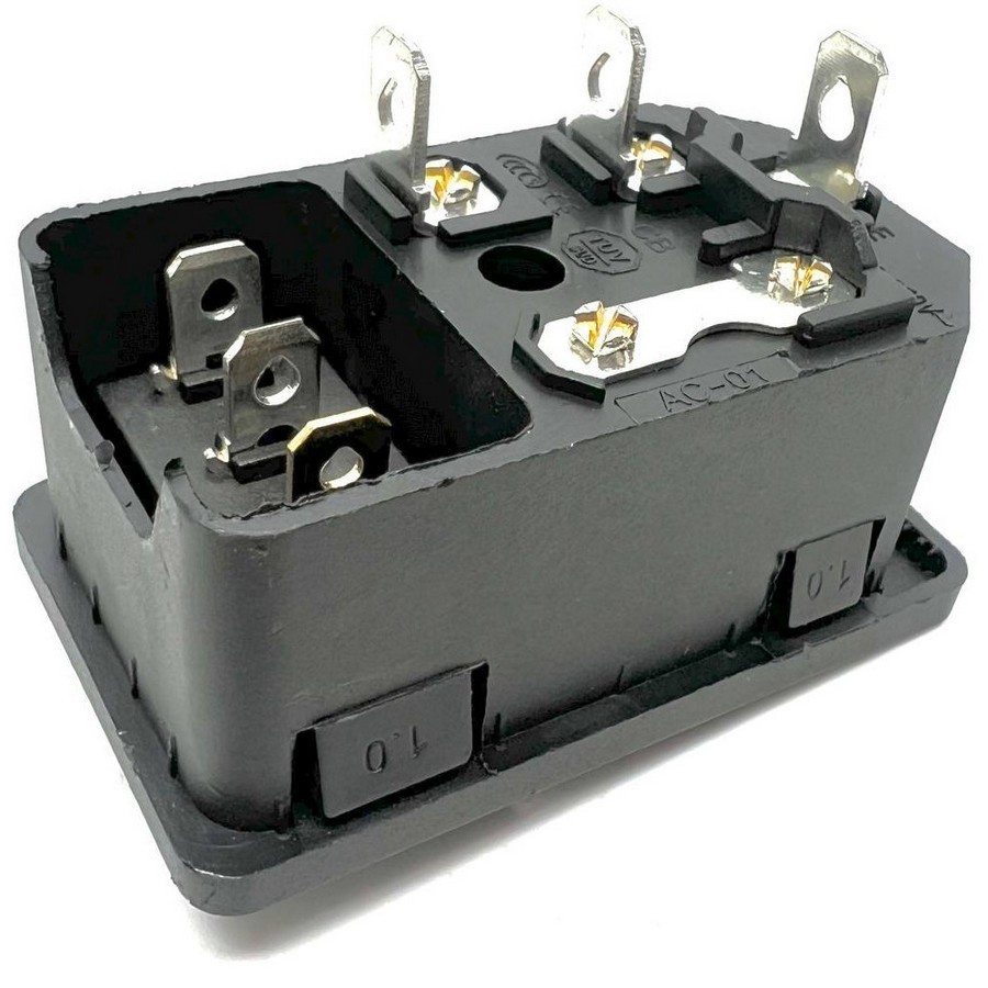 Разъем питания 3 контакта, с выключателем и отсеком для предохранителя. Цвет выключателя: зеленый. 250 В. 10 А. Без подсветки. Защелки: 1 мм.