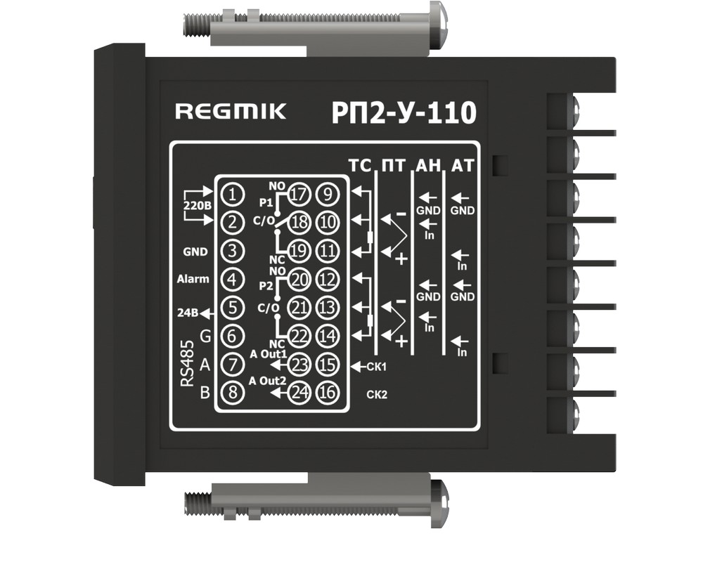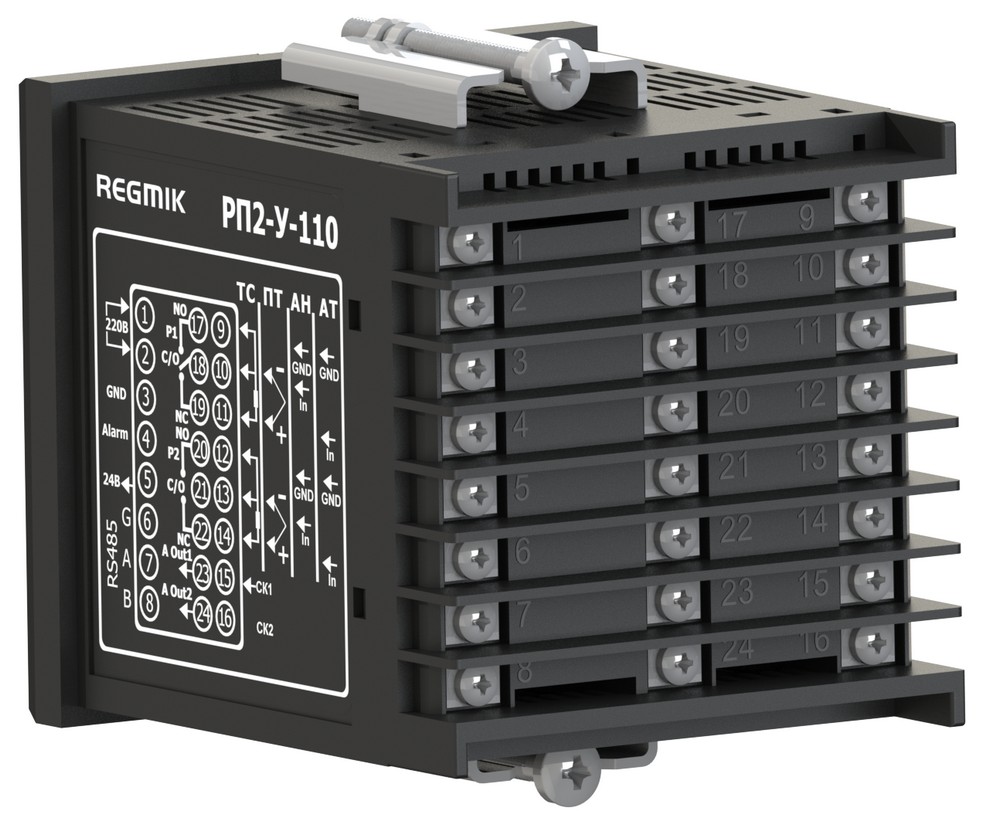 Универсальный двухканальный регулятор с таймером РП2-У (исполнение для монтажа на DIN-рейку) предназначен для измерения, регистрации и регулирования температуры теплоносителя. Возможно применять для измерения физических параметров (температура, влажность, давление и пр.) различных сред в сушильных шкафах, печах различного назначения и прочем технологическом оборудовании. Двухканальный регулятор температуры с таймером имеет дополнительный выход для формирования сигнала аварии. Монтаж регулятора температуры выполняется на DIN-рейку. РЕЖИМЫ РАБОТЫ ДВУХКАНАЛЬНОГО РЕГУЛЯТОРА С ТАЙМЕРОМ: Измеритель; Измеритель с аварийной сигнализацией; Двухпозиционный регулятор температуры или других физических величин; Двухпозиционный регулятор с таймером; Трехпозиционный регулятор; Трехпозиционный регулятор с таймером; Дискретный ПИД-регулятор; Дискретный ПИД-регулятор с таймером; Аналоговый ПИД-регулятор; Аналоговый ПИД-регулятор с таймером; ПИД-регулятор для управления задвижкой; ПИД-регулятор для управления задвижкой с таймером; ПИД-регулятор в системе нагреватель/холодильник; Погодозависимый регулятор температуры; Преобразователь входной величины в аналоговый сигнал; Ручной задатчик аналогового сигнала; Блок расширения входов/выходов. ОСОБЕННОСТИ ДВУХКАНАЛЬНОГО РЕГУЛЯТОРА ТЕМПЕРАТУРЫ С ТАЙМЕРОМ РП2-У: Алгоритм адаптивной самонастройки ПИД-регулятора с улучшенными характеристиками точности настройки коэффициентов и быстрым выходом на уставку; Погрешность измерения составляет 0,25% от диапазона измерения входной величины без учета погрешности входного датчика; Защита параметров регулятора с таймером от несанкционированного доступа; Два независимых канала регулирования с выдержкой по времени; Работа таймера с наклоном и без наклона в одном цикле; Программирование 10 программ работы таймера; Выбор без пароля одного из заранее настроенных режимов работы таймера; Настройка работы выхода аварийной сигнализации по шагам (ON/OFF) в цикле; Удобная навигация по меню; Поддержка английского и русского языка в меню; Информативный многофункциональный индикатор; Обновленный корпус регулятора с таймером. Универсальный двухканальный регулятор с таймером, заменяет целый ряд приборов: Измеритель: И1, И2, И2-01; Двухпозиционный регулятор: РД1, РД2; ПИД-регулятор: дискретный и аналоговый РП1, РП2; ПИД-регулятор для управления задвижками: РП1-З, РП2-З. Основные характеристики:Питание:12…24 VDC. Внутренний блок питания: 24 VDC, нагрузочная способность 60 мА. Универсальные входы (2 входа): термопреобразователи сопротивления; преобразователи термоэлектрические; датчики с унифицированным выходным сигналом тока (0…5 мА, 0…20 мА, 4…20 мА); датчики с унифицированным выходным сигналом напряжения (0…1 В, 0…5 В, 0…10 В). Дискретные входы (4 входа): ПУСК/СТОП/ПАУЗА таймера/блокировка выходных устройств. Интерфейсы: RS-485 (протокол ModBus RTU); изолированный RS-485 (протокол ModBus RTU). Дискретные выходы (4 выхода): электромеханическое реле (5А, 220 VAC); транзисторный ключ (100 мА, 60 VDC); транзисторная оптопара (100 мА, 60 VDC); симисторная оптопара (100 мА, 220 VAC). Выход аварийной сигнализации (2 выхода): транзисторный ключ (100 мА, при 60 VDC). Аналоговые выходы (2 выхода)