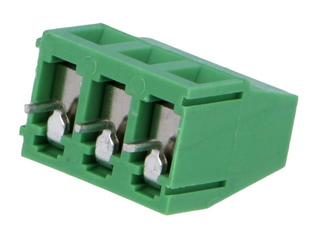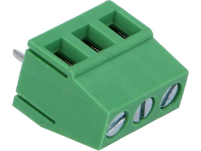 Клеммник гвинтовий, з рельєфною обоймою, крок 5 мм.контактов 3: 300В. 15А. зелений