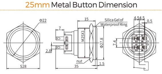 Плоска, нормально відкрита, D = 25 мм, без фіксації, точкова LED, BLUE (синя), 9-24V, нержавіюча сталь