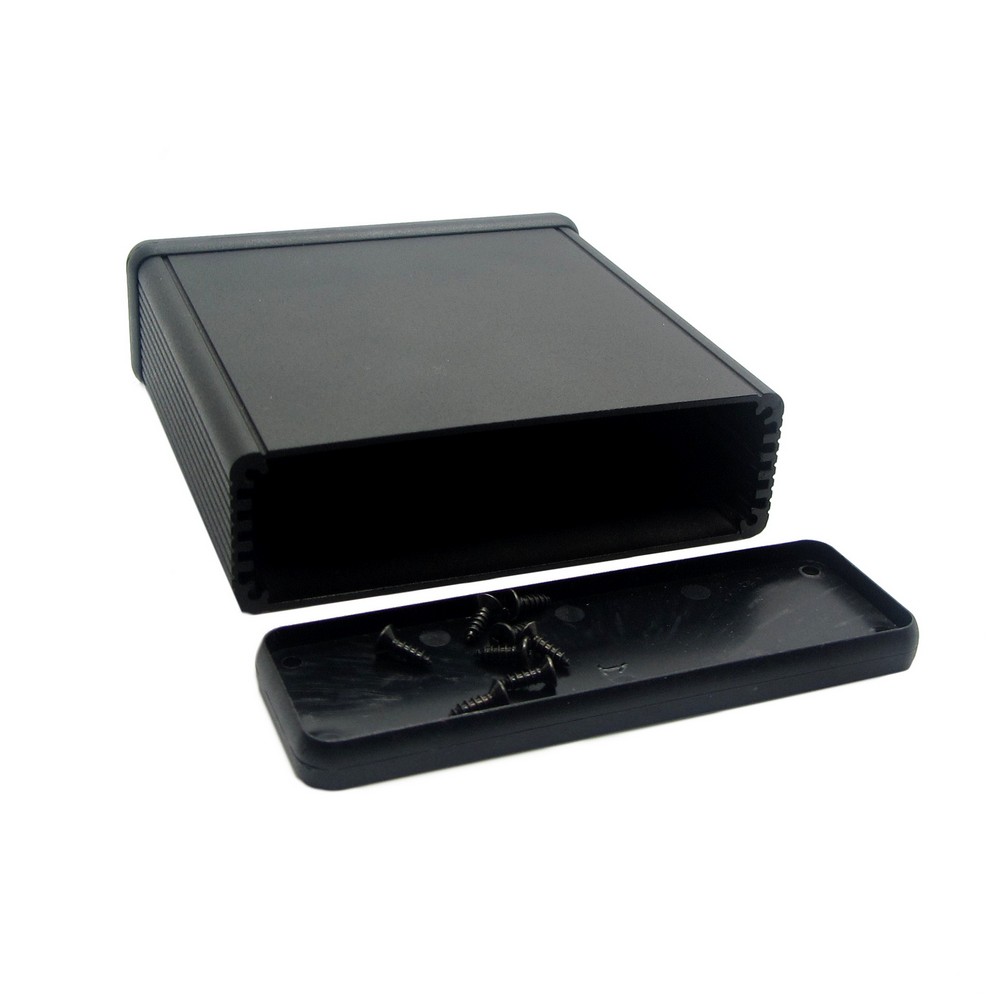 Корпус алюмюмініевий, чорнений, анодований, з пластиковими кришками, розміри (ДхШхВ): 100х103х30,5 мм. Колір кришок: чорний