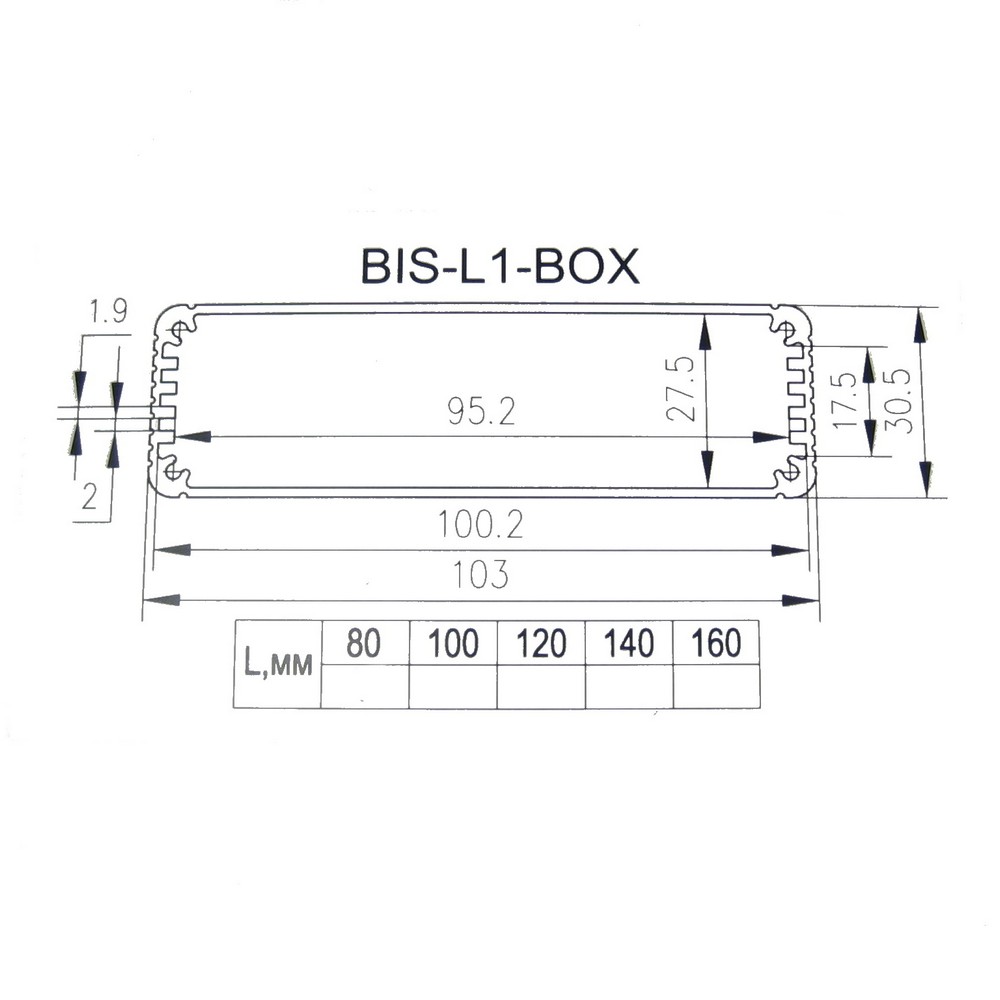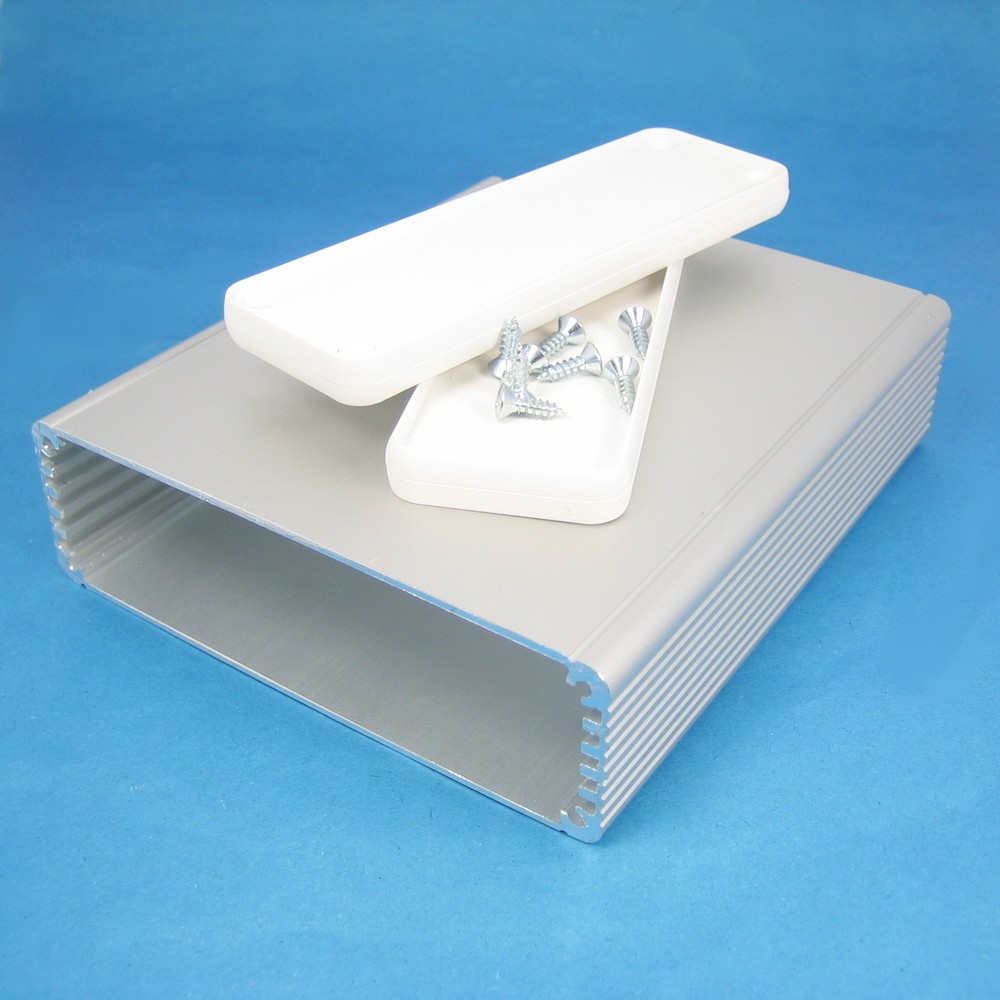 Корпус алюмюмініевий, анодований, з пластиковими кришками, розміри (ДхШхВ): 120х103х30,5 мм. Колір кришок: білий