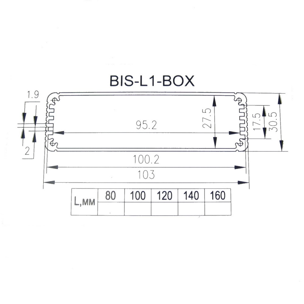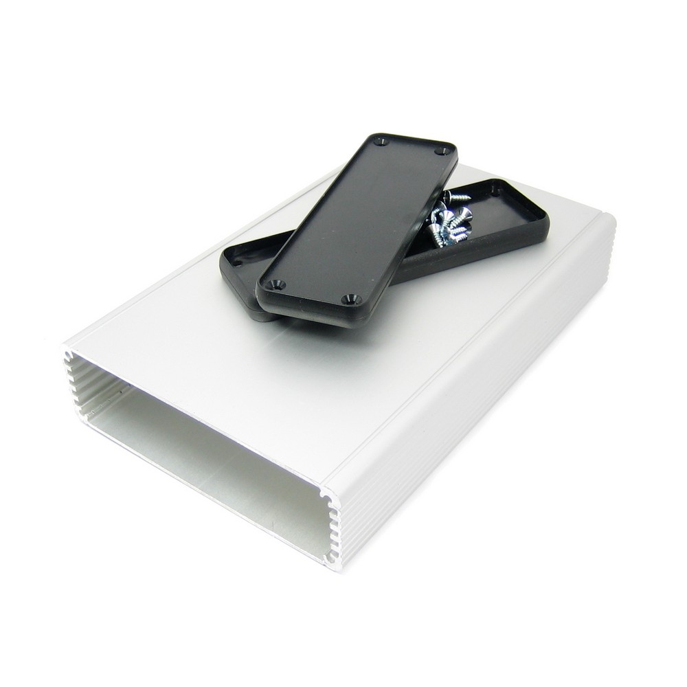 Корпус алюмюмініевий, анодований, з пластиковими кришками, розміри (ДхШхВ): 160х103х30,5 мм. Колір кришок: чорний