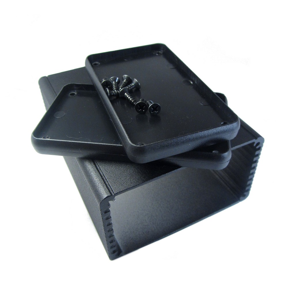 Корпус алюмюмініевий, чорнений, анодований, з пластиковими кришками, розміри (ДхШхВ): 100х78х43 мм. Колір кришок: чорний