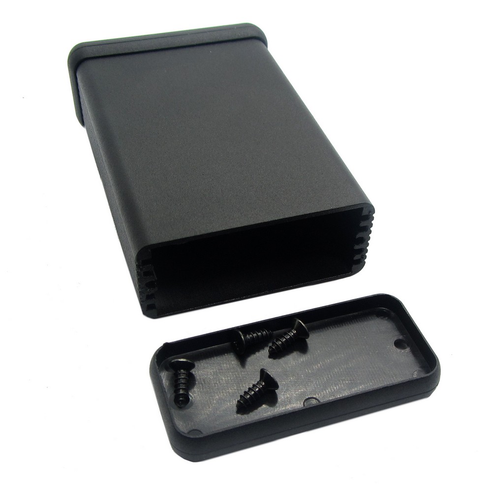 Корпус алюмінієвий, чорнений, анодований, з пластиковими кришками, розміри (ДхШхВ): 80х54х23мм. Колір кришок: чорний.