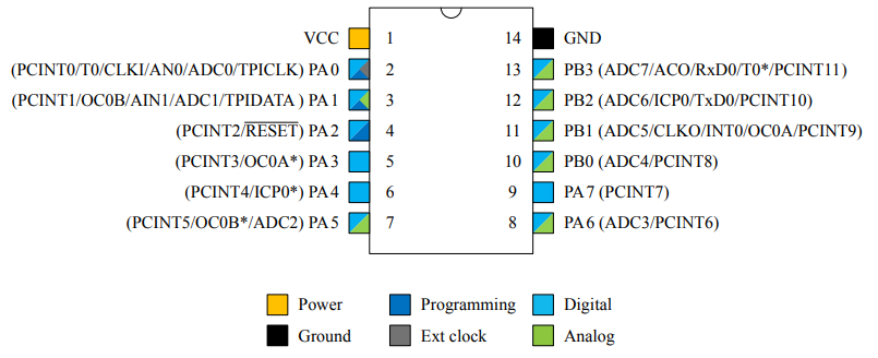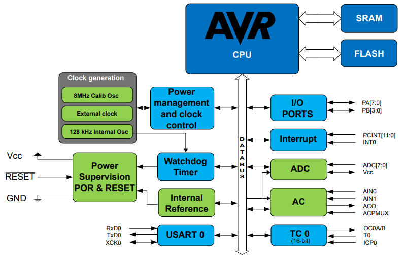 Високопродуктивний 8-розрядний мікроконтролер на основі RISC (RISC) Microchip tinyAVR® picoPower® поєднує в собі 1 КБ внутрішньосистемно програмованої флеш-пам'яті, 32 КБ SRAM, 12 ліній введення-виведення загального призначення, 16 робочих регістрів загального призначення, один 16-розрядний таймер/лічильник з двома каналами ШІМ, внутрішніми та зовнішніми перериваннями, 8-канальний 10-розрядний аналого-цифровий перетворювач, вбудований аналоговий компаратор, один повнодуплексний USART, програмований сторожовий таймер із внутрішнім генератором, внутрішньо калібрований генератор, 10-канальний байт унікальний ідентифікатор (серійний номер), три відкалібровані внутрішні опорні напруги (1,1 В, 2,2 В и 4,3 В) і чотири програмно обираються режими енергозбереження. Пристрій працює в діапазоні 1,8-5,5 вольт.