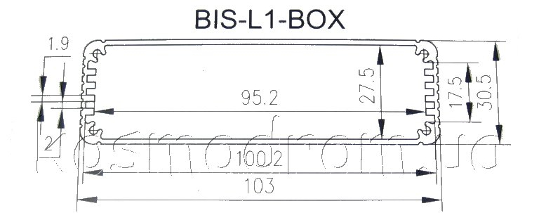 Алюмінієвий приладовий корпус BIS-L1 призначений для монтажу електронних пристроїв в корпусі. Конструктивно складається з профілю екструдованого анодованого алюмінію та двох пластикових торцевих панелей з отворами під чотири гвинти.. Пластикові панелі легко піддаються механічній обробці. Корпус розроблений спеціально для конструювання широкого кола приладів.