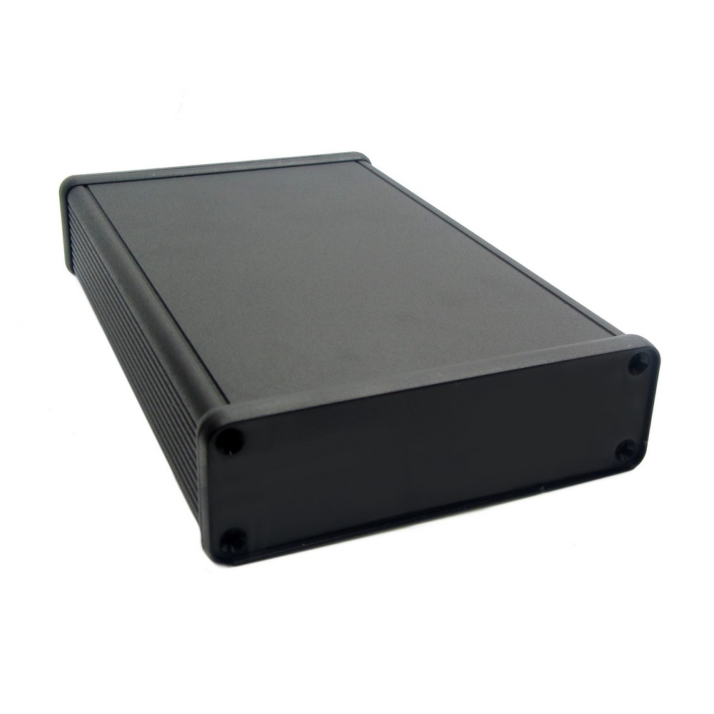 Корпус алюмюмініевий, чорнений, анодований, з пластиковими кришками, розміри (ДхШхВ): 160х103х30,5 мм. Колір кришок: чорний