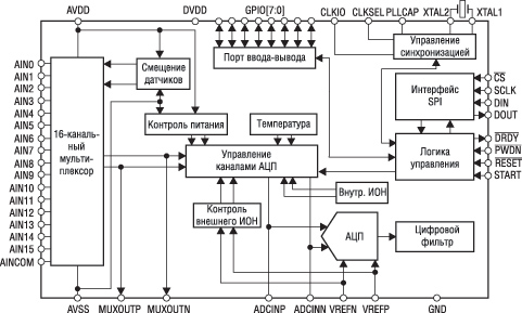 Розглянемо можливості одного з представлених у таблиці АЦП – ADS1258 як приклад. Цей АЦП призначений для 24-бітового перетворення 16 несиметричних або 8 диференціальних сигналів зі швидкодією до 23,7 кГц/канал (тобто оцифрування всіх 16 каналів становить менше 700 мкс). Сигнали можуть бути як однополярними, так і двополярними. Функціональна схема АЦП представлена малюноку 1.