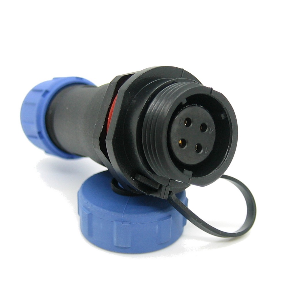 SP13, гніздо, PIN:4, IP68, діаметр кабелю: 4~6.5мм, 200В, 5A, паяння, на провід, із захисною кришкою