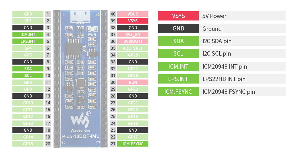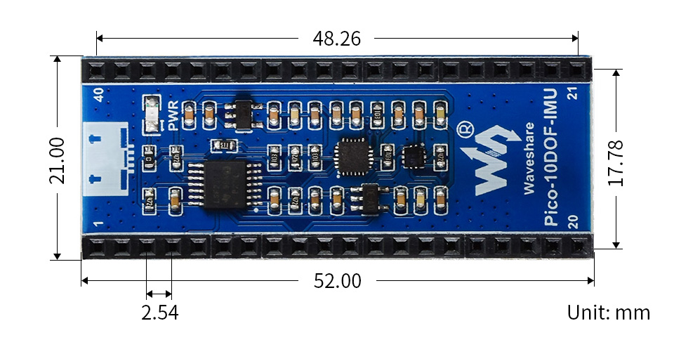 Pico-10DOF-IMU - це модуль розширення спеціалізований для Raspberry Pi Pico. Він включає датчики: гіроскоп, акселерометр, магнітометр, барорецептор, і використовує шину I2C для зв'язку. У поєднанні з Raspberry Pi Pico його можливо використовувати для збору даних про навколишнє середовище, таких як температура та атмосферний тиск.