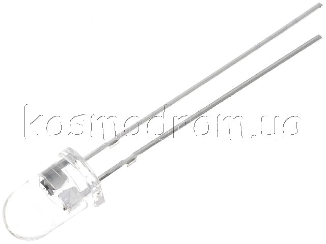LED: 5мм: білий white холодний: 30000-40000мкд: 19-21лм: 30°, колірна температура 6500 K, прозорий корпус