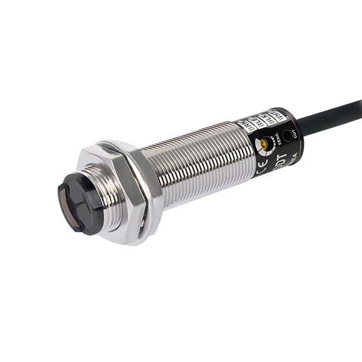 Циліндричний фотоелектричний датчик з прийомом відбитого променя діаметром 18мм, дифузний, вiдст. сраб .: 0-100 мм, живлення: 12-24VDC, режим роботи: no / nc, тип виходу: npn, з відкритим колектором