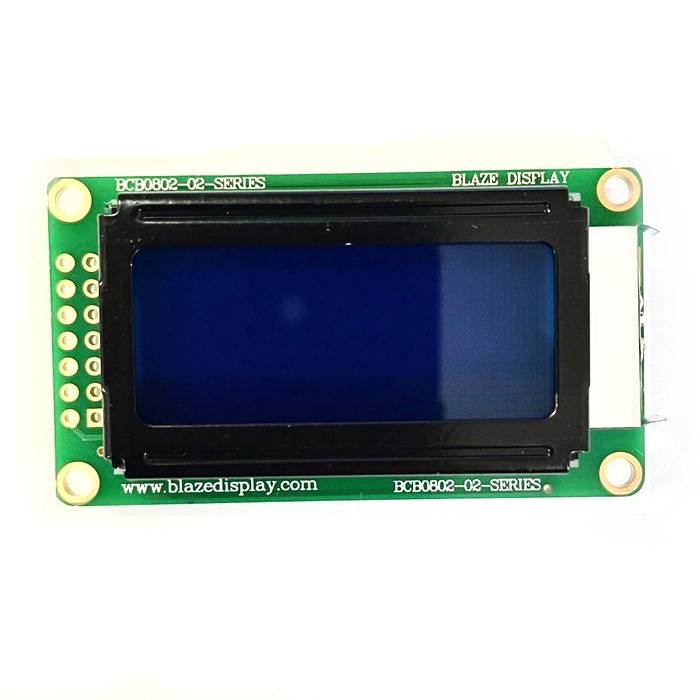 8 символів, 2 рядки, розміри 58.0x32.0 мм, колір символів: синій, фону: сірий, розмір символів: 2.96x5.56, 6800 interface, ST7066, English/Cyrillic Font
