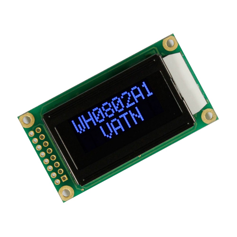 РКІ модуль: 8 символів 2 рядки: Розміри 58.0x32.0 мм: колір символів: білий, фону: синій, Розмір символу: 2,96х5,56 мм. WH0802A-TMI-CT English and Cyrillic Font