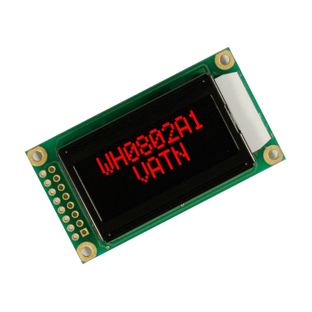 ЖК-дисплей, VATN, 8 символів 2 рядки, колір підсвічування: червоний, Інтерфейс: 6800 interface (ST7066 IC), розміри: 58х32 мм, Розмір символів 2,96х5,56 мм, English/Cyrillic Font
