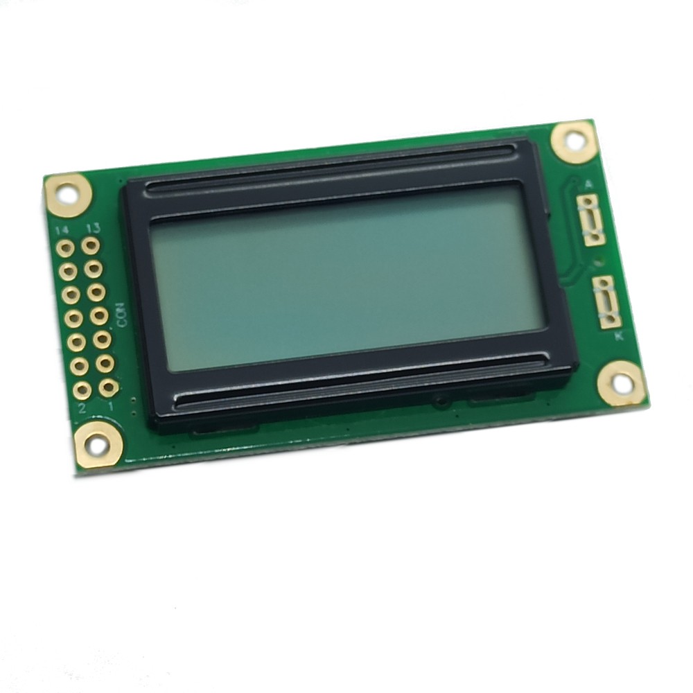 ЖК-дисплей, VATN, 8 символів 2 рядки, колір підсвічування: зелений, Інтерфейс: 6800 interface (ST7066 IC), розміри: 58х32 мм, Розмір символів 2,96х5,56 мм, English/Cyrillic Font