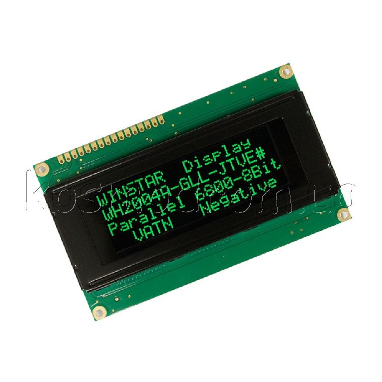 ЖК-дисплей, VATN, 20 символів 4 рядки, колір підсвічування: зелений, Інтерфейс: 6800 interface (ST7066 IC), розміри: 98х60 мм. Розмір символу: 2,95х4,75 мм, English/Cyrillic Font