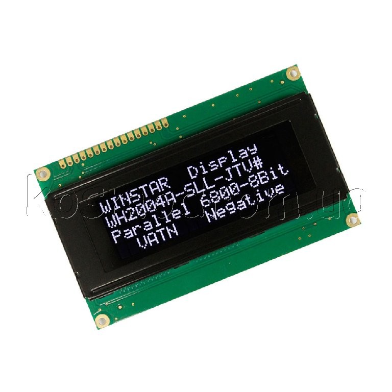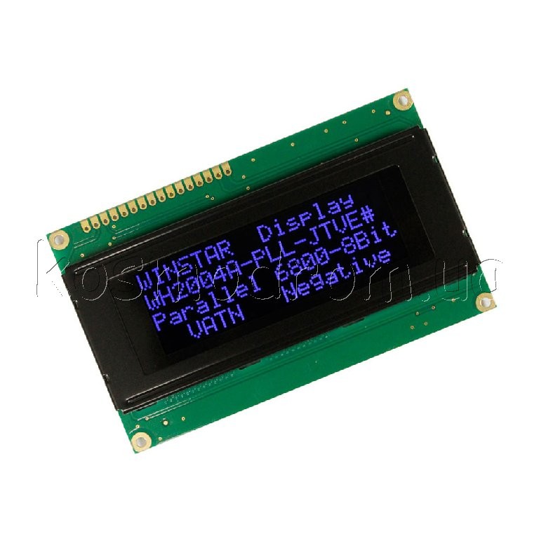 ЖК-дисплей, VATN, 20 символів 4 рядки, колір підсвічування: білий, Інтерфейс: 6800 interface (ST7066 IC), розміри: 98х60 мм. Розмір символу: 2,95х4,75 мм, English/Cyrillic Font