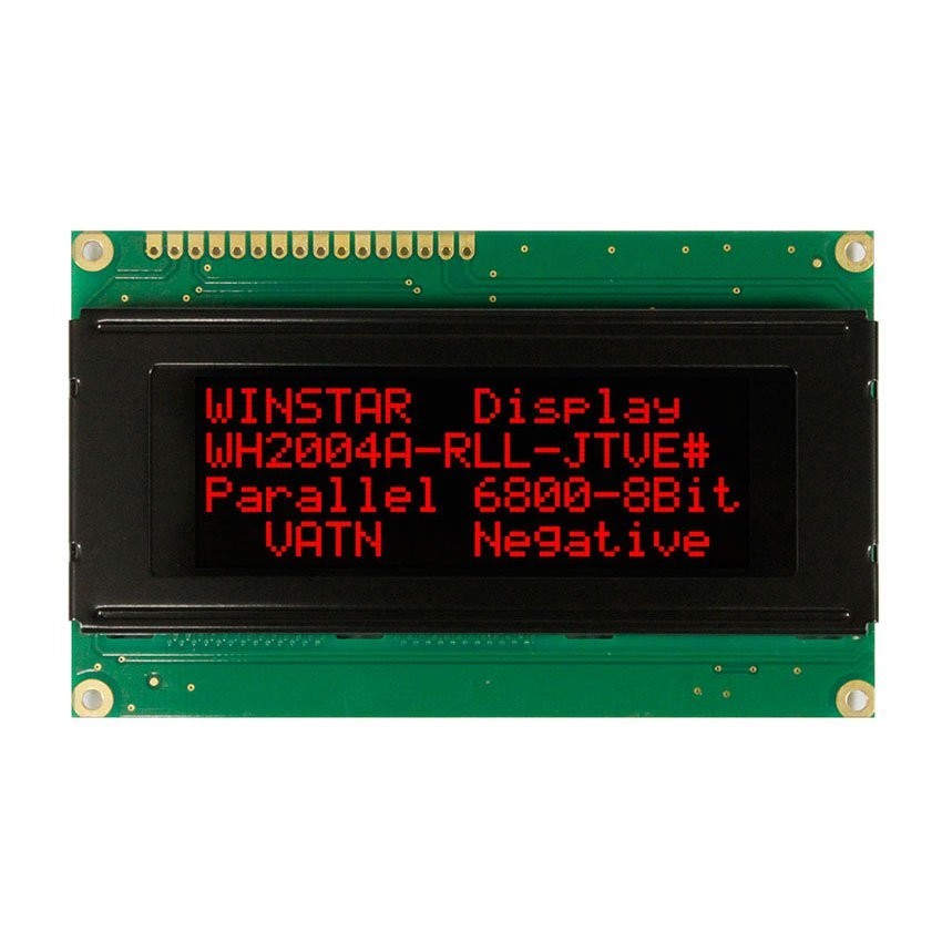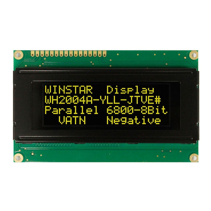 ЖК-дисплей, VATN, 20 символів 4 рядки, колір підсвічування: жовто-зелений, Інтерфейс: 6800 interface (ST7066 IC), розміри: 98х60 мм.Размер символу: 2,95х4,75 мм, English/Cyrillic Font