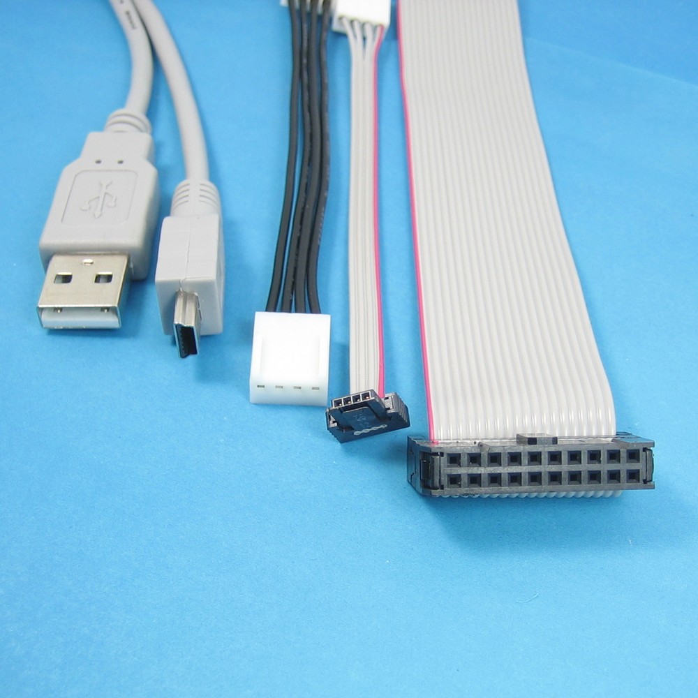 У комплект зазвичай входять сам програматор ST-LINK/V2, кабелі для підключення, а також перехідники для різних типів роз'ємів, що використовуються на платах налагодження та розробки.