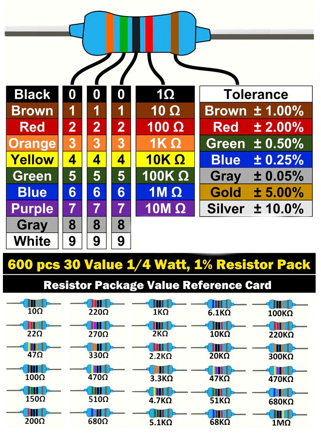 Набір складається із 30 номіналів вивідних резисторів 1/4 Вт. 1% 20 шт. У пластику