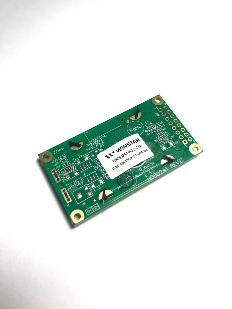 8 символів, 2 рядки, розміри 58.0x32.0 мм, колір символів: синій, фону: сірий, розмір символів: 2.96x5.56, 6800 interface, ST7066, English/Cyrillic Font