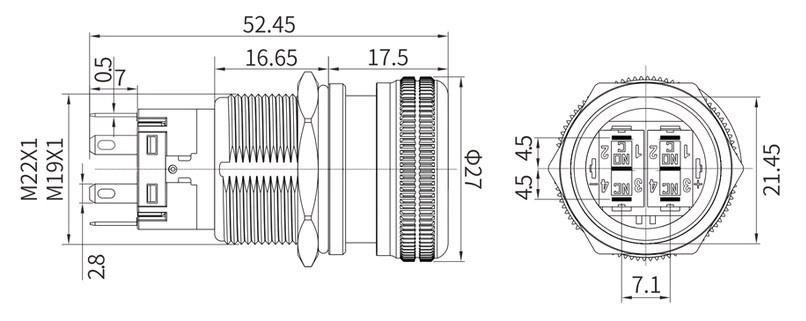 Клавиша безопасности - Stopbutton, 19 мм, 1NO1NC, без подсветки, с фиксацией, нержавеющая сталь, 5...24V