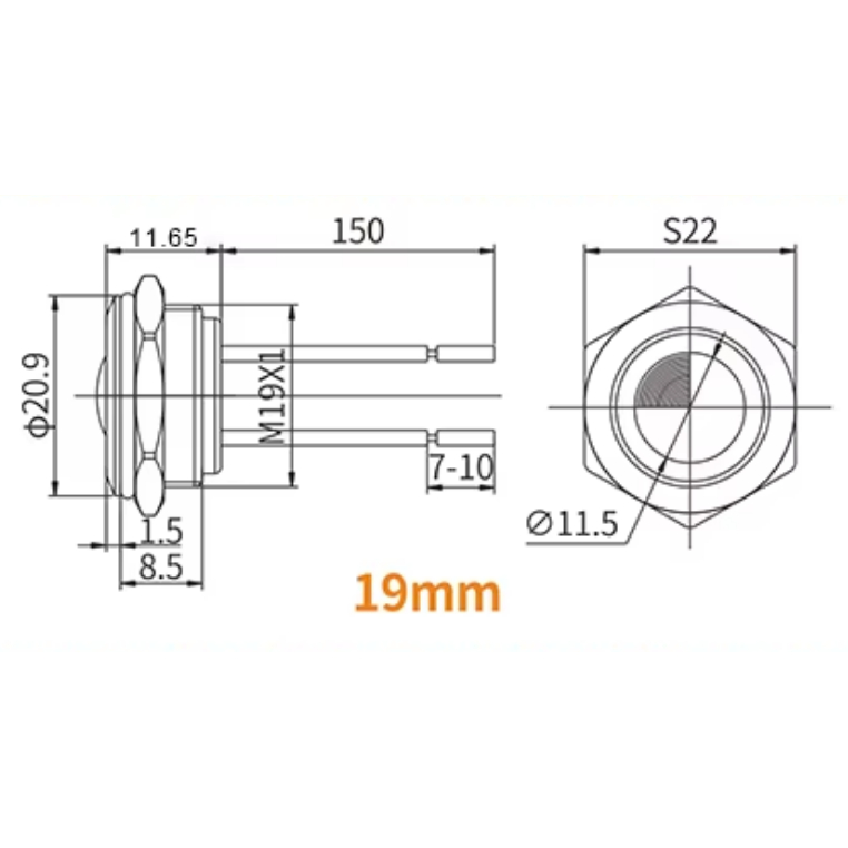Лампа сигнальная, светодиодная, в металлическом корпусе D=19 мм, LED GREEN (зеленый), 5-24V
