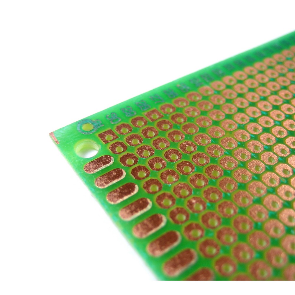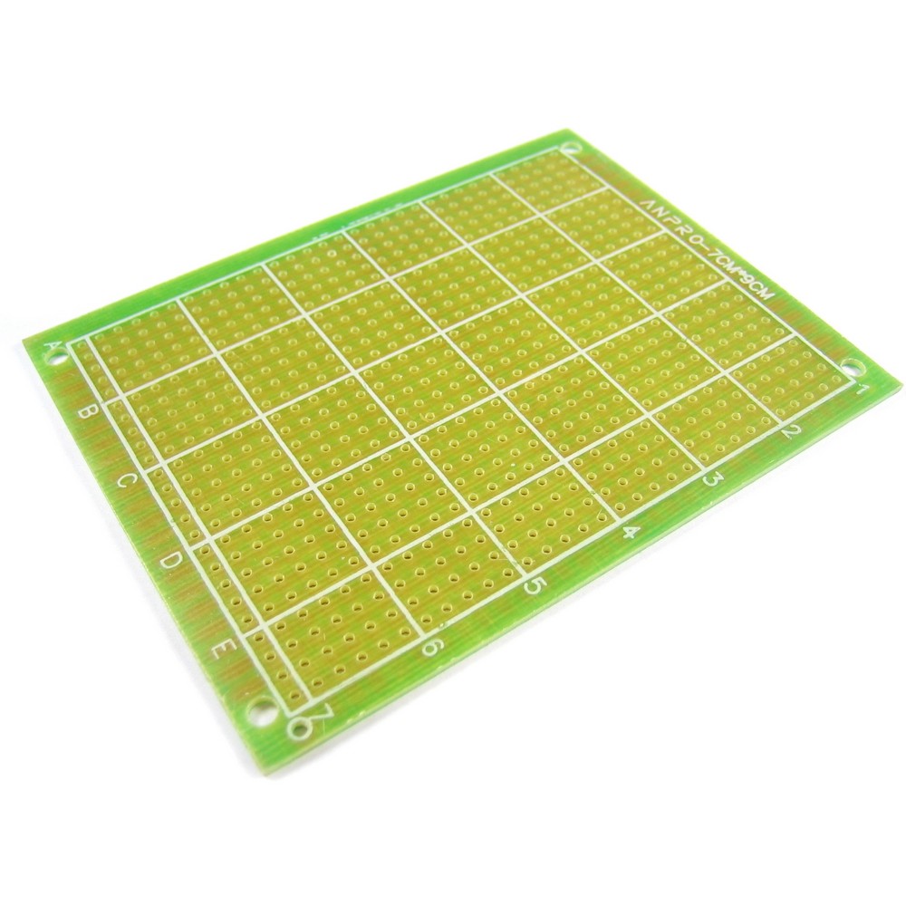 Макетная плата, односторонняя, без металлизации отверстий, размеры 70х90 мм. Цвет маски зелёный. Шаг 2,54 мм.