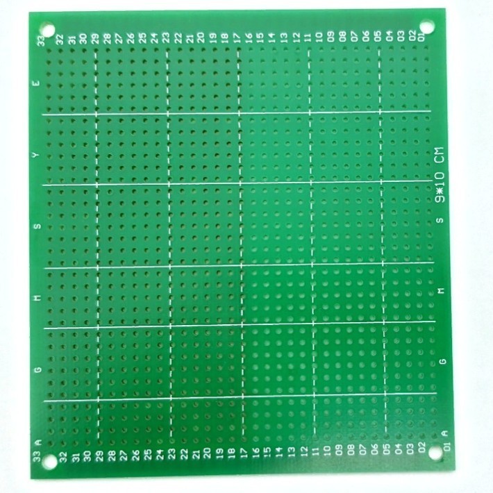 Макетная плата, односторонняя, луженые контакты, размеры 90х100 мм. Цвет маски зелёный. Шаг 2,54 мм.