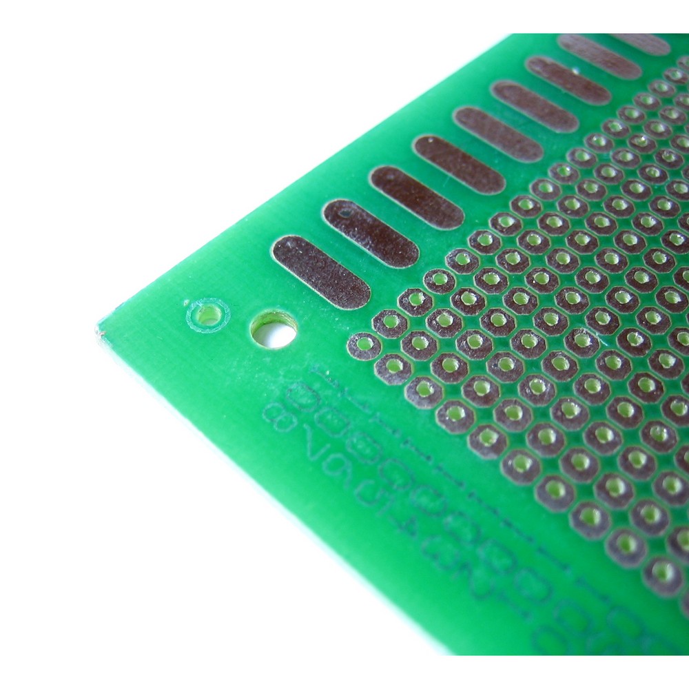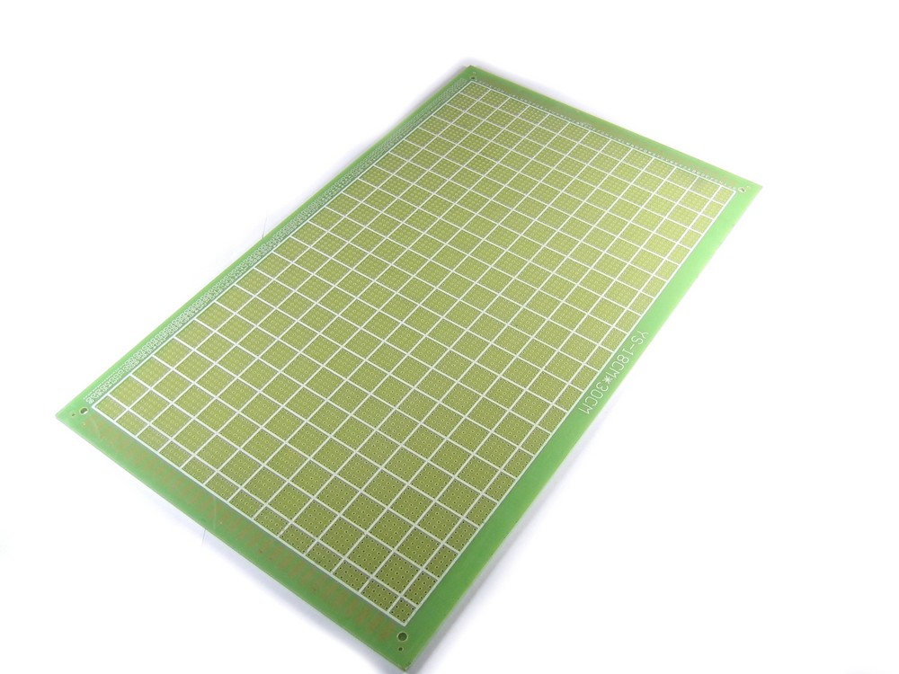 Макетная плата, односторонняя, без металлизации отверстий, луженые контакты, размеры 180х300 мм. Цвет маски зелёный. Шаг 2,54 мм.