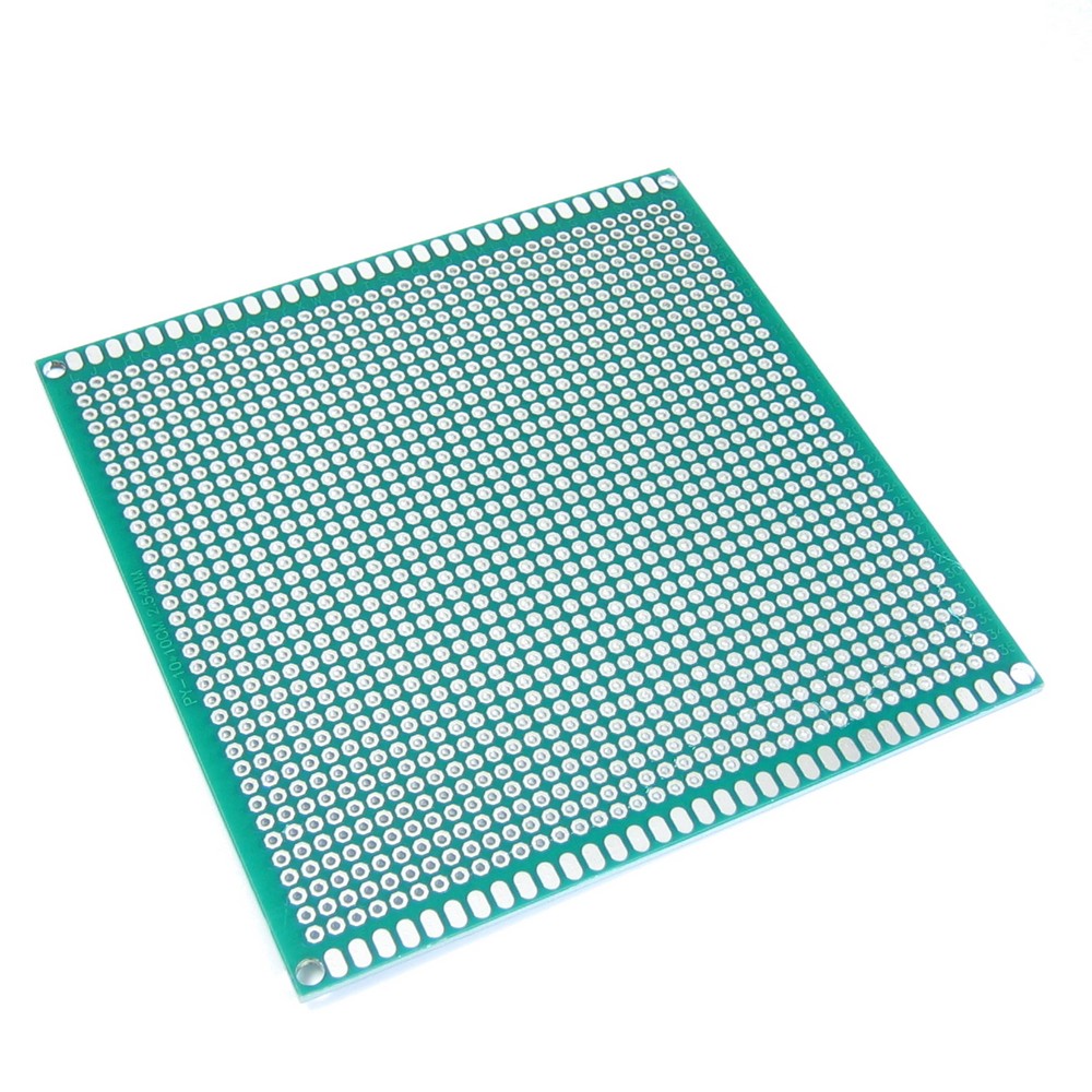 Макетная плата, двухсторонняя, с металлизацией отверстий, размеры 100х100 мм. Цвет маски зелёный. Шаг 2,54 мм.