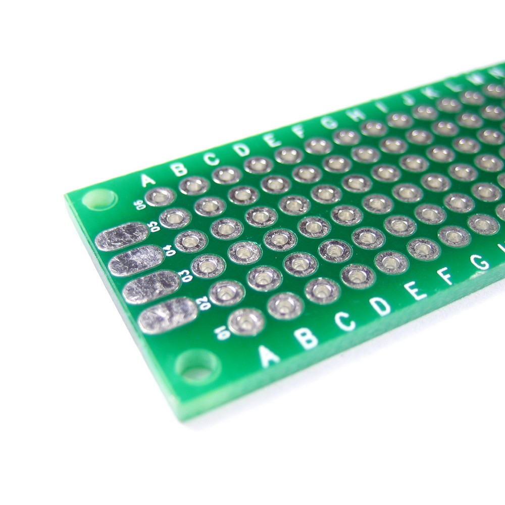 Макетная плата, двухсторонняя, с металлизацией отверстий, размеры 20х80 мм. Цвет маски зелёный. Шаг 2,54 мм.