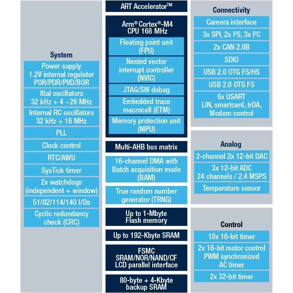 Ядро: ARM Cortex-M4 с FPU (Floating Point Unit, Тактовая частота: До 168 МГц., Память: 1 МБ Flash-памяти, разъем TYPE-C