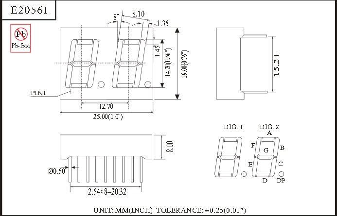 Светодиодный индикатор, общий катод, высота символа 14,22 мм, двухсимвольный, цвет свечения желтый яркий. Статическая индикация