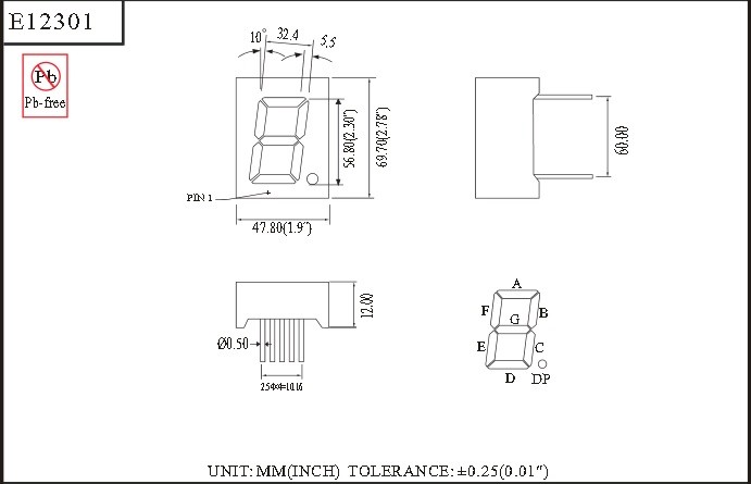 Светодиодный индикатор, общий АНОД, высота символа 58,4 мм, односимвольный, цвет свечения красный ЯРКИЙ.