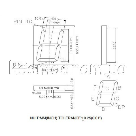 Светодиодный индикатор, общий катод, высота символа: 101,6 мм, односимвольный, цвет свечения: красный яркий